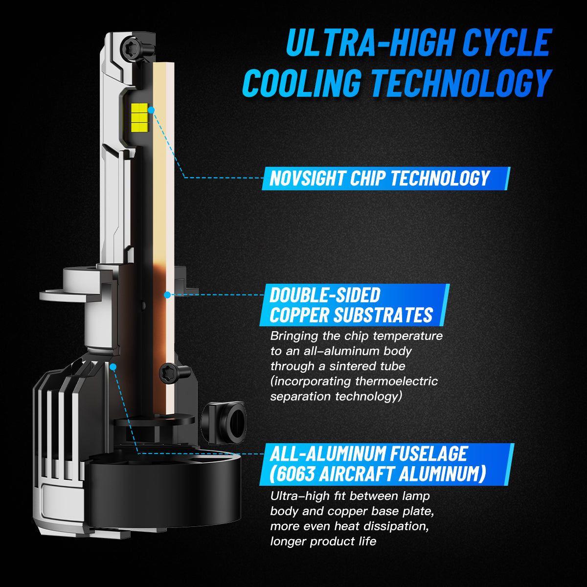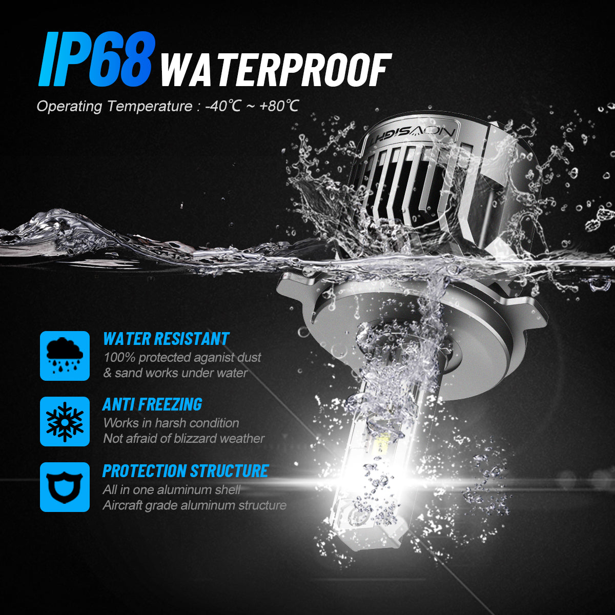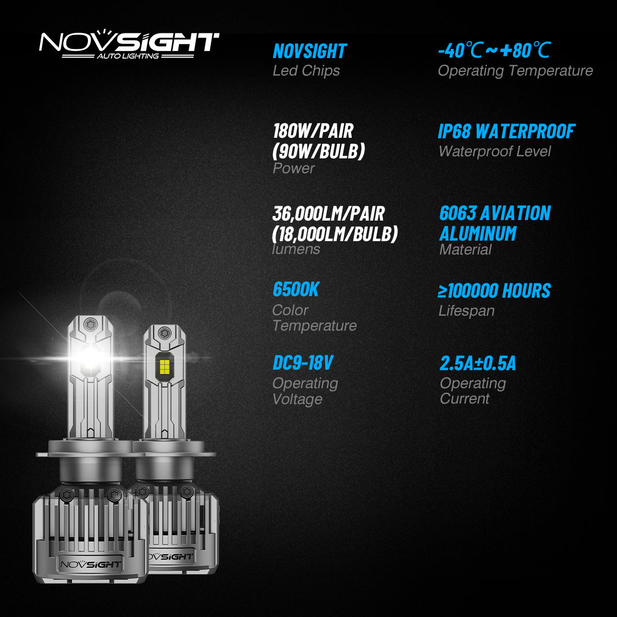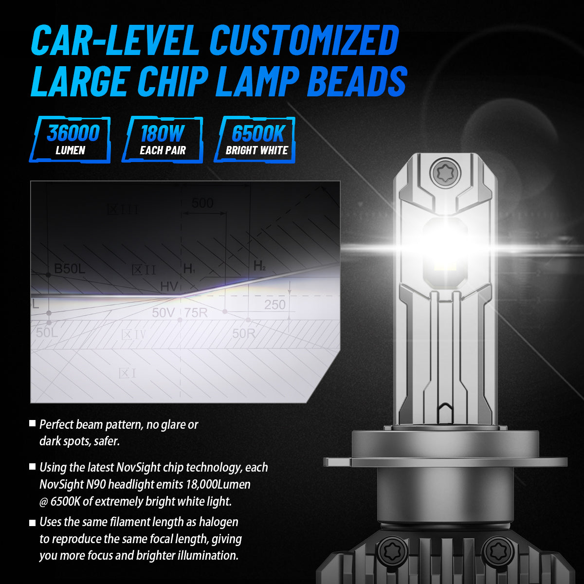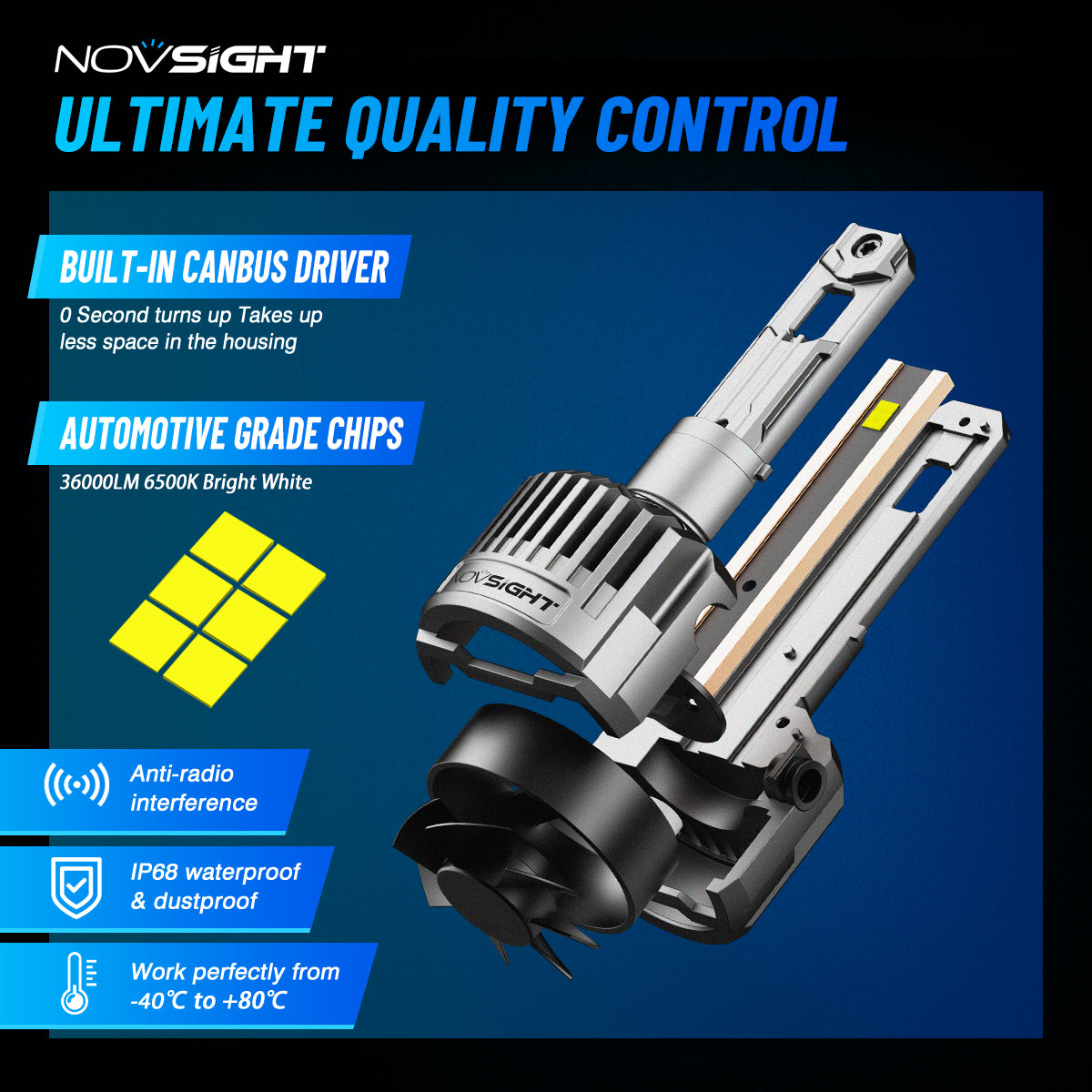 The Novsight N90 LED bulb is designed for perfection, these bulbs achieve a flawless beam pattern that eliminates glare and dark spots, ensuring a safer and clearer driving experience. With superior brightness powered by high-grade NovSight chip technology, they emit an impressive 36,000 lumens per pair at a crisp 6500K bright white colour temperature, dramatically enhancing your nighttime visibility. The advanced cooling system, featuring double-sided copper substrates and an aviation-grade aluminium shell, guarantees optimal heat dissipation for stable performance. Plus, the built-in CANBUS driver ensures instant startup without radio interference, while robust waterproofing keeps your bulbs protected in any weather. Upgrade your ride today and illuminate the road ahead!